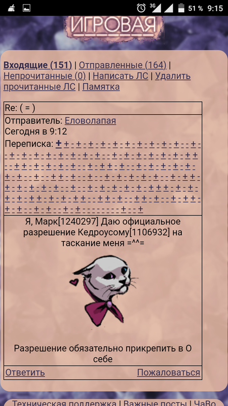 ![]() | ᅠ | ![]() Северный клан Испытательный срок: (Выполнено) Куратор: [ Игрок удалён ] Охота: 8/8 ∆∆∆∆∆∆∆∆ Дозор: 5/5 часов Боевые умения: Великий воин (7 уровень) Деятельность в клане: Активно хожу в патрули/охоты/свободные охоты/дозоры/травники, ношу котят на Дрейфующие льды (спокойно пишите в ЛС с темой), могу поймать бабочку, поднять камень на складе, провести экскурсию, но это реже. Экзамены ИЗТ БЗ ПТЗ ОИН Скалолаз Активно ломаю рёбра, отбиваю себе окорока, лазая по скалам. Пловец Гребу против течения, пытаясь держать голову над водой, мочу шерсть в ледяной воде. | ᅠ | ![]() Стихи для любимой (взято из сериала "Великолепный век"): Едва взглянув, могла бы без труда ты Постичь, как я люблю. Но ты отводишь взгляд. Глаза ль в моем недуге виноваты? Я - голос тростника! Я, право был бы рад, Как соловей, сладчайших песен звуки Тебе дарить сто тысяч лун подряд. Когда душа, сгорая от разлуки, Как мотылек, в огне надежд дрожит, Не стоит удивляться этой муке. Извечно к Мекке обращен магнит, Мой взор к тебе прикован неотрывно, Так отчего ж душа моя болит? Вздыхаю, жду и плачу непрерывно: Ужели я с тобой не буду слит? Ужель умру от жажды этой дивной? | ᅠ | ![]() ᅠ | ![]() Семья и прошлое Семья Приёмная мать: Альфред Приёмный отец: Мягкие Перья Падшего Ангела Пара: [ Игрок удалён ] Есть котята которые остались одиночками, а также приёмные из того же города, но есть и из клана. Прошлое Синехвост-Синехвостик: Грозовое племя, приблизительно сентябрь 2019г., причина смерти- отравление. Синекрыл-Синекрылик: Грозовое племя, сентябрь 2019г., причина смерти-отравление. Дождехвост-Тростниковокрылик: Грозовое племя, октябрь 2019г., причина смерти-отравление. Мятнокрылик: Грозовое племя, январь 2020г., причина смерти-взломали и удалили. Чешуйный-очень-очень много имён-Серебристик: Одиночки-Северный клан, февраль-август 2020г., причина смерти-самоубийство, перерождение. | ᅠ | ![]() |