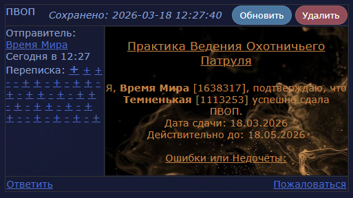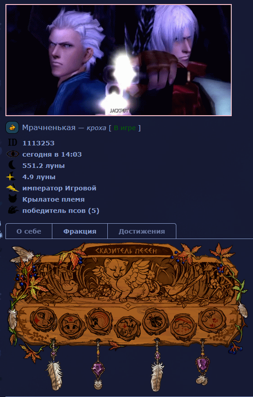 младшая служительница жизни хранитель порядка рассказчик, редактор исследователь глубин 1 ранга ступающий по облакам 1 ранга а также наставляющий крылатые ведомости собиратель развлекатель |   | ![]() |   | âa мрачненькая - темненькая - тёмный лебедьâa мужо жен нет. была паучьей сетью, âa угрызение совести, виновникâa учила любимая Душенька жила в кпв, реке, вт, ов была сказителем песен! дышу лигой, хойо и музыкой всегда не против поболтать:) ПВОП, ПВП |   | ![]() |