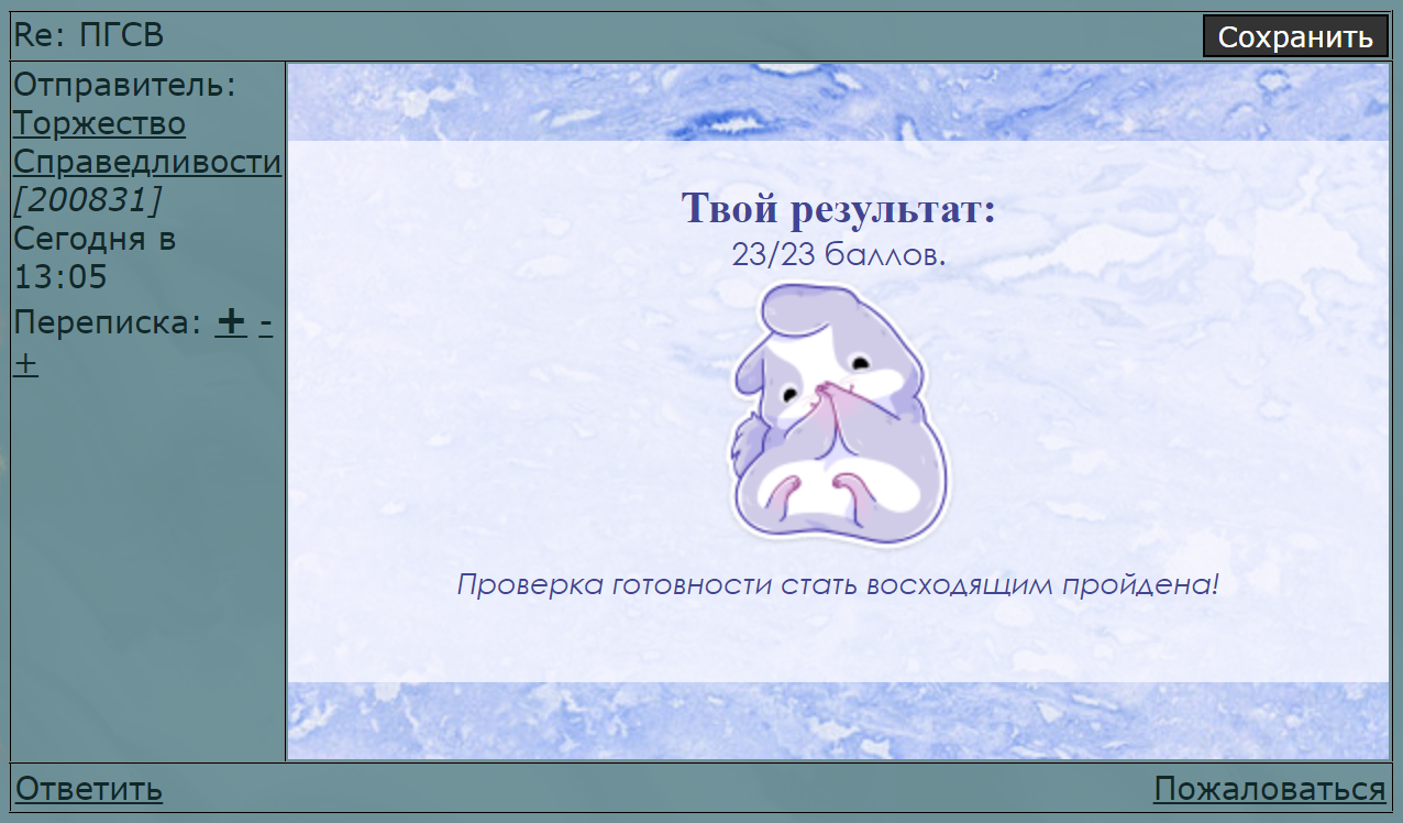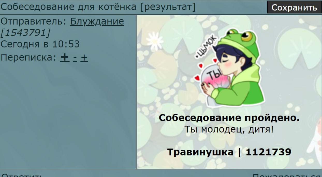 ![]() | Я кто Студентка-типапрограммистка. ISTJ, интроверт, меланхолик и вот это вот всё. Постепенно превращаюсь в своё тотемное существо - ворчливого и занудного деда. Таков путь. На самом деле не такая уж и зануда, но бывает, да. Интересуюсь деланием всякого руками - чутка готовлю вкусняхи, чутка вышиваю, чутка плету из мулине, чутка рисую. Играю в разные игры, слушаю разную музыку. "Мор. Утопия" из игр и рок с околобардовской тусовкой из музыки - наиболее западающее в душу. Обожаю читать. Так исторически сложилось, что под руку мне обычно попадается только фэнтези, но люблю того же Достоевского. Не могу сказать, что "состою" в каких-то фандомах, но не против пообсуждать что-то из просмотропрочитанного. |
