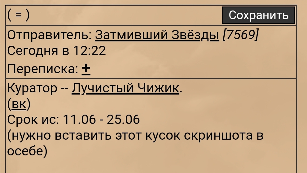 ![]() | . | . ✝ Угля |Кармашек| Пеп ✝ Здравствуй, дорогой путник. Позволь рассказать немного о себе. Семья Родился под покровом мамы Война Бесконечности и папы, который очень любит жаб. С каждым новым поцелуем понемногу очищаюсь Я кручусь, она скучает Я грущу - она спасает. ♥ ♥ ♥ Прошлое Могли знать как: Синицегласая [одичи-тени, 2019 - 2021], Борзая [луна, 2021], Синицегласая [кпв, 2021], Хитрый Лжец [тени, 2022], Синицегласая [тени, 2022 - 2023] . ✝ Обучение и прочее ✝ Обучает чудесный Лучистый Чижик. Обучаюсь крепко держать стрелу в лапках во 2мз. По ту сторону экрана Старушка, играющая в пиксельных котов. Не очень активен по причине работы. Барабабашка, барабаню... Совсем чуть-чуть гитарист (играть на 4 аккордах весело)). Вроде как фотограф. Не кусаюсь, люблю общаться. (будто сайт знакомств, ржу). На варе с конца 18го года. вк тг тгк инста душ душ . |