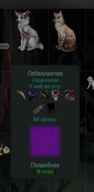 ![]() | ───────── • ✤ • ───────── Лебединая Грация | Пуш | Воительница![]() БЗ | ПТЗ | ИЗТ | ОИН | УБИТ | ОВЭ В СК обучалась у прекрасной Элечки Курировала меня Меткость Один день за лапку в воинскую жизнь вел Цит! ^^ ЦИ: Лебедёнок – Лебедь – Лебединая Грация – Лебедушечка – ... Бывшие должности в Северном клане Пловец – имею право посещать воды и Будущая наставница – познаю все тонкости обучения юного поколения Душ1 Душ2| лист персонажа | актуальный лор | ВК | арт-группа вы могли меня знать Люблю качать бу! По этому поводу пишите в лс Родилась у Завлекающая и Три Крыла У меня есть папа-муж и брато-муж!! (не завидуйте, окда?) Очень люблю детей! Могу вас приютить! С Юрким воспитала двух старшеньких детишек ^^ А с ним подарила жизнь ещё нескольким прекрасным котикам северного клана! • • • Он ушел в путешествие :0 Люблю дружочка-пирожочка! Окрас Цитатник ^^ ───────── • ✤ • ───────── |