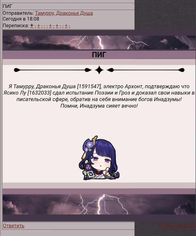 • Акиуро Лури| Аки • ![]() | ♡Семья♡ Породили на свет прекрасные Лисëнок и Скорбь, а приютили под крыло Морамур и Мелиноя есть замечательная пара Сцилла ———★——— В Рил я одинокая 19 летняя девчушка которая отдала себя работе, не стесняйтесь подходить знакомиться) (Я не кусаюсь, пока что) ———★——— Блоги 。・:*:・゚★,。・:*:・゚☆ Главный блог Сошедших Свод законов | Награды Мондштадт | Ли Юэ | Инадзума Натлан | Снежная | Фонтейн Сумеру |