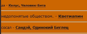 Все ценят мою ярость... А я ведь буквально ДЬЯВОЛ во плоти... Я очень зол со всеми и хочу рипнуть всех, но никто этого не пока не подозревает... А ведь у меня уже есть план и тетрадь смерти, хех...)... так что... лучше не связывайтесь со мной)... Лучше молитесь Транзакции и мне пока я вас не рипнул...))... хах)... Даже костюм в игровой на моем коте намекает, что я демон во плоти, ведь у меня есть рога и нож во рту... Хахахах) люди жалкие пешки... Лучше цените времена, пока вы живы хех)