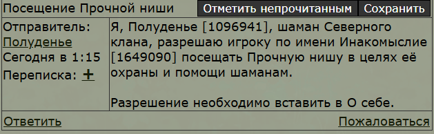 ![]() | Личные рекомендации по сборам. Будет славно, если вы уделите буквам ниже немного внимания и последуете советам. Позже всё будет вынесено в соответствующие документы и этот блок благополучно сократится в размере. ОБЩЕЕ: ► Сборы проводятся на высокой громкости, чтобы их было заметно. ► Старайтесь озвучивать инструктажи ближе к отправке по маршрутам / локациям. Так их увидят и те, кто отозвался сразу, и те, кто подошел позднее. ► Чётко разделяйте верхнюю и нижнюю ветки патруля / локации охотничьих угодий и не склоняйте имена, когда отправляете участников, каждый должен видеть себя и куда он должен идти, иначе есть шанс, что участник потеряется. ► Напоминайте о необходимости хранить молчание во время сборов! Также можно указать требование к участникам прямо во время сбора: — Попрошу тишины во время сбора. Желающие в пограничный патруль? Напоминаю: для участия в пограничном патруле ваш переход должен быть не больше минуты. — Тишина во время сбора. Пловцы от 5 ПУ без сна и увечий, желающие в водный патруль? — Храним тишину во время сбора. Желающие отправиться на охоту? ПАТРУЛИ: ► Документ по организации сборов пограничных патрулей. ОХОТЫ: ► Ведущему будет желательно озвучивать в чате не только команду выдвигаться, но и путь до локации. ► Ведущему будет желательно проверять, вся ли дичь унесена с локации и не присоединился ли к охоте кто-то еще, поэтому не спешите уносить свою добычу, будьте готовы проинформировать о времени окончания охоты и предоставить шаблон отчёта возможным опоздавшим. ► Присоединиться к охоте можно в течение 20 минут после прихода на локацию. Можете не дожидаться разрешения ведущего, достаточно поставить его в известность, чтобы вас не потеряли. ► При охоте на упитанную дичь есть шанс словить особую дичь. Она выглядит иначе и её можно определить по названию, которое высвечивается при нажатии на неё во рту или взаимодействии с ней. Такую дичь необходимо указывать в отчёте отдельной цифрой. Документ, который поможет определить упитанность и особенность дичи. ► От ведущего требуется собрать отчёты с участников охоты на своей локации и отправить собирающему в личные сообщения. Пример сообщения ведущего: — Охота длится 20 минут, оставшееся время даётся на уборку. Разрешается ловить до 3 единиц дичи любой упитанности. Отчет мне в ЛС по шаблону [[n]link[/n]ID] (кол-во дичи). С носильщиков только ID. Особую дичь помечайте. Охотимся до nn:nn. Удачи! По окончании охоты, как на обычную дичь, так и на мышей, пишется отчёт ведущему в лс по шаблону ниже, носильщики же отписывают только свой айди. [[n][n]link[/n][/n]ID] (кол-во дичи) (если ведущий не собирающий) / [[n]link[/n]ID] (кол-во дичи) (если ведущий собирающий) | ![]() |