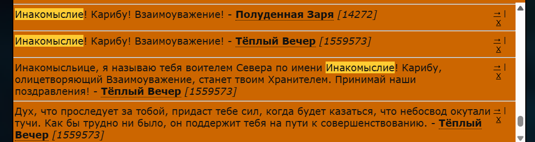![]() | ► Главный администратор группы Севера. Актуализирую данные в переписи, принимаю в группу и чищу из неё, слежу за соблюдением правил и их актуальностью, отвечаю на вопросы, запросы и предложения, выдаю медали за выслугу админам. Меня можно дёрнуть за рукав, если вам долго не отвечают в личных сообщениях группы. ► Оратор. Временами собираю и посещаю патрули, водники и охоты. Учитываю пожелания. Всегда имею возможность быть ведущим. ► Чистильщик. Уношу спящих с лагерной и внелагерной территории в номерные вне зависимости от локации; фиксирую нарушения правила о сне в неположенных местах для крупногабаритных. Можете попросить не таскать вас какое-то время, если вам это очень мешает, например, качать активность или проценты пары с вашим товарищем; можете попросить не чистить локации, если сами хотите это сделать на медаль. Тагайте полным именем в чате, чтобы я увидел, если вы проснулись во рту. ► Проводящий еженедельные охотничьи турниры. Провожу турниры. Каждое воскресенье в 15:00 вместо охотничьего патруля на одном из охотничьих угодий проходит состязание, о котором объявляется в лагере за 10 минут до начала. Все желающие принять в нём участие и имеющие 5 УН и выше и статус «воспитанник» и выше могут подойти на назначенную локацию до начала состязания. [!] Турнир не засчитывается переходящим в испытательный срок, как посещение охоты. ► Член творческого содружества. Артист отряда певчих: наряжаюсь, озвучиваю, таскаю; писака-мифотворец: при необходимости корректирую и пишу сценарии, диалоги, блоги и другие тексты; рисовальщик (не живописец): изредка что-то рисую для мероприятий, если те мне более-менее интересны и времени на подумать над ними достаточно. ► Беркут. Проверяю дозорных преимущественно каждую среду еженедельно, бракую отписи при наличии нарушений. ► Разведчик с полным комплектом допусков. Могу пронести через горы и туннели и снять с лазательных меньших по возрасту. Ношением котят на скалы не занимаюсь, обращаться к Хранителям очага. ► Собиратель. Собираю хилерские ресурсы с территории и за её пределами в свободное время. | ![]() | ► Охранник и подмастерье Прочной ниши. Слежу за порядком, выдаю травы и ракушки с перьями, собираю травники. Крайне не рекомендую пропускать инструктажи мимо ушей. Информирую по целебным ресурсам и всем видам болезней, кроме переломов от падений. Я старый для лазательных механик. — запрещены лишние прыжки по Нише и взаимодействие с кучей с ресурсами не с целью положить туда свой ресурс. — для получения предметов и за лечением следует пройти в Шепчущие Покои и ожидать указаний шамана или его помощников. — приходя с травника, спокойно ожидайте, когда с кучи с ресурсами спрыгнут, прежде чем сесть на неё. Скакать по локации не нужно. ► Пловец. Вытаскиваю, переношу через глубокие воды и вожу понырять меньших по возрасту. Ношением котят на дно не занимаюсь, обращаться к Хранителям очага. ► Красный лис. Компактный носильщик и сопровождающий на рейдах. ► Позже. ► Груша. Встаю в дг и ог по необходимости. ► Отщепенец гвардейского батальона. Ничего не делаю, мне неинтересно бегать. Но раз в год палка всё же стреляет. ► Опционально: Сайтовый тестер, талисман, поддержка, глаза и уши стен. ![]() ► Бывший глава и обновляющий уголка чистоты. Отвечал за запрос медалей, обновлял таблицу нарушений и список чистильщико