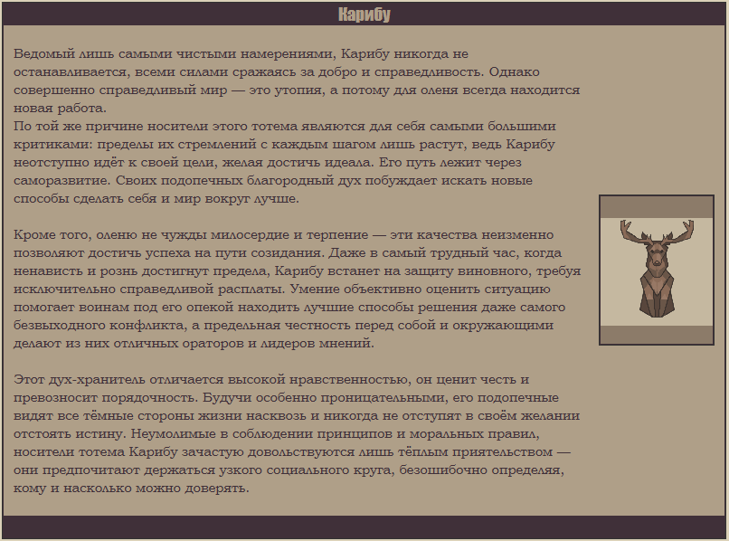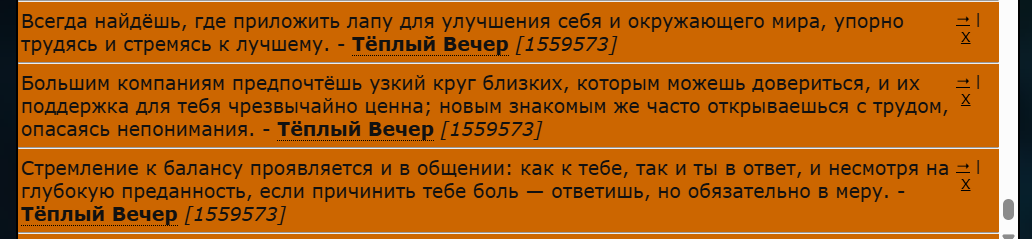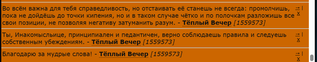 ![]() | ![]() | ![]() | Методист, учитель, бухгалтер, менеджер, логист, писака, управляющий, так себе шутник в рабочем пространстве и абсолютно уставшее и голодное тело. Личностно перфекционист, педант, импульсивный упрямец и гордец с багажом принципов. Крайне избирательная натура, мне сложно понравиться. Это нормально, что мы с вами можем не найти общий язык. Исключения, тем не менее, случаются. Презираю плашки, ачивки и захламленную статусовку в профилях. Люблю гармоничные медали под осебе, которые не растягивают расстояние между лунами, временем захода игрока и его статусом. ![]() | ![]() |