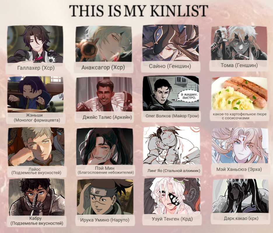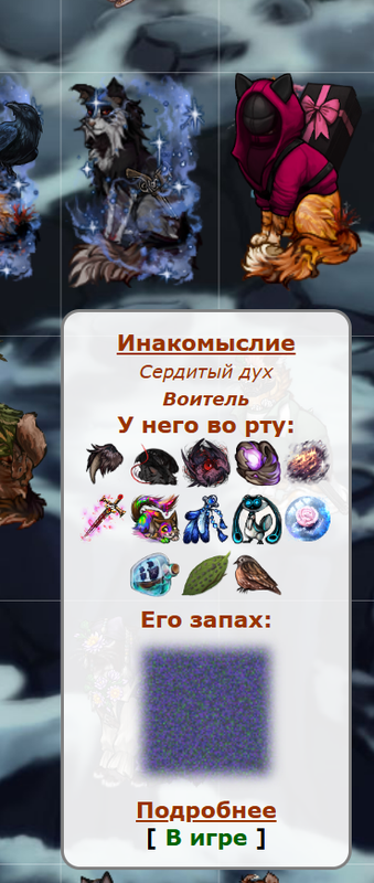 ![]() | ![]() | ![]() | Прошлые персонажи: Дэдпул — Жрец — Лживый Сыщик — Профессор Анаксагор [2015-2016 гг] Азраил [2016 г] — Лунопляс — Небрежненький — Небрежноус — Закон Гласит [2019 г] Безразличненький — Презреннолап — Небрежноус — Небрежный Взор (тотем) [2018-2019 гг] Колыбелюшек — Баюкающий (тотем) — Джеймс Мориарти [2020 г] Всевидященький — Ретроградный Меркурий — Съесть Заживо — Око Соломона [2020-2021 гг] Ведун — Зов Глубин [2021 г] Ярозовушек — Ирука Умино — Офицер Галлахер [2022 г] Вздорушек — Вздорный — Пылкий Вздор (тотем) [2022-2025 гг] В игре где-то с 2014 года. В ск все его 7,5 лет от создания до сегодняшнего дня. Побольше о персонажах, возможно, будет написано в черновом документе. Там же находится и более полный список прошлых персонажей. Большинство из них подвергаются и ещё будут подвергаться редизайну и обзаведутся иконками в обозримом будущем, если звёзды сойдутся. Взор, Вздор, Зов — игра в закономерность. Сыграем теперь в посчитайку? Это моя любимая игра. | ![]() | ![]() | ![]() |