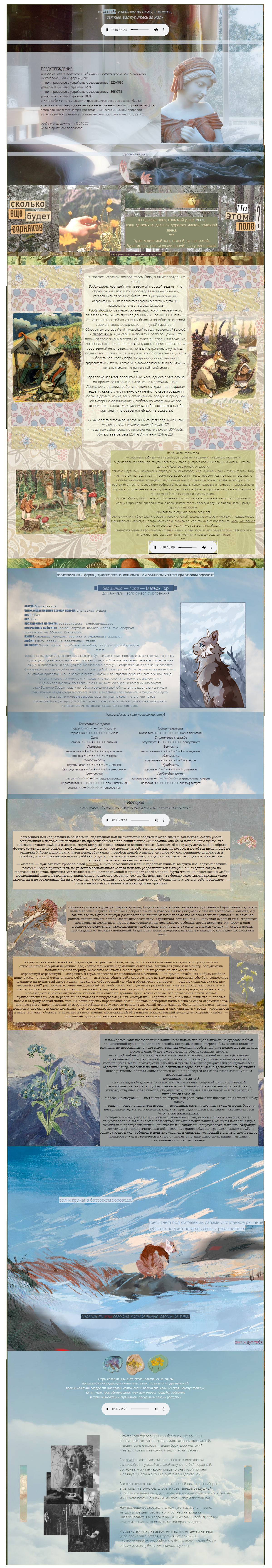 ПРЕДУПРЕЖДЕНИЕ! для сохранения первоначальной задумки рекомендуется воспользоваться нижеизложенной информацией: — при просмотре с устройства с разрешением 1920x1080 установите масштаб страницы 125% — при просмотре с устройства с разрешением 1366x768 установите масштаб страницы 100% в << о себе >> присутствуют открывающиеся-закрывающиеся блоки, а так же ссылки, ведущие на несвязанные с данным сайтом сторонние ресурсы. автор вдохновляется лагерными-гитарными песнями; дикой природой алтая и кавказа; древними произведениями искусства и многим другим. осебе в виде документа [25.10.20] желаю приятного просмотра! | .... | ![]() |